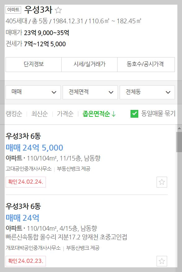 우성 3차 아파트인데요. 여기는 위의 래미안 아파트들과 다르게 작은 평수가 없고 큰 평수만 존재합니다.