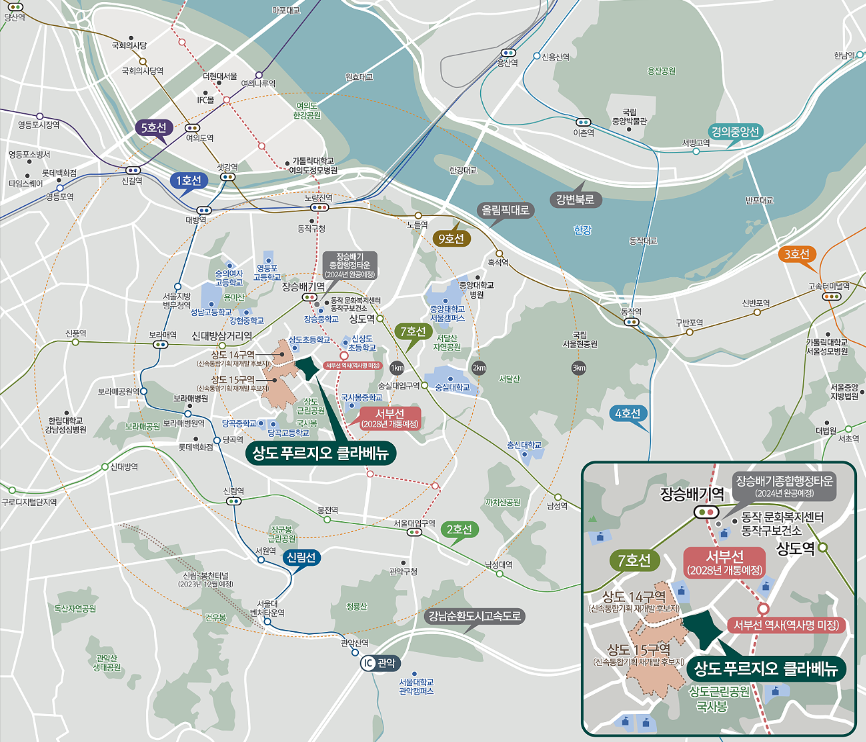 또한, 7호선을 이용하기 좋은 입지 그리고 상도 14, 15 구역 재개발이 추진됨에 따라 바로 옆인 상도 푸르지오 클라베뉴도 덩달아 미래가치가 상승할 수도 있습니다.