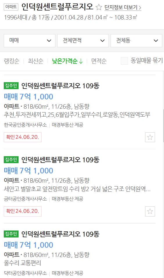 인덕원센트럴 푸르지오의 네이버부동산 호가입니다. 평형대는 마찬가지로 전용면적 60㎥(24평형), 84㎥(32평형)이 있습니다.