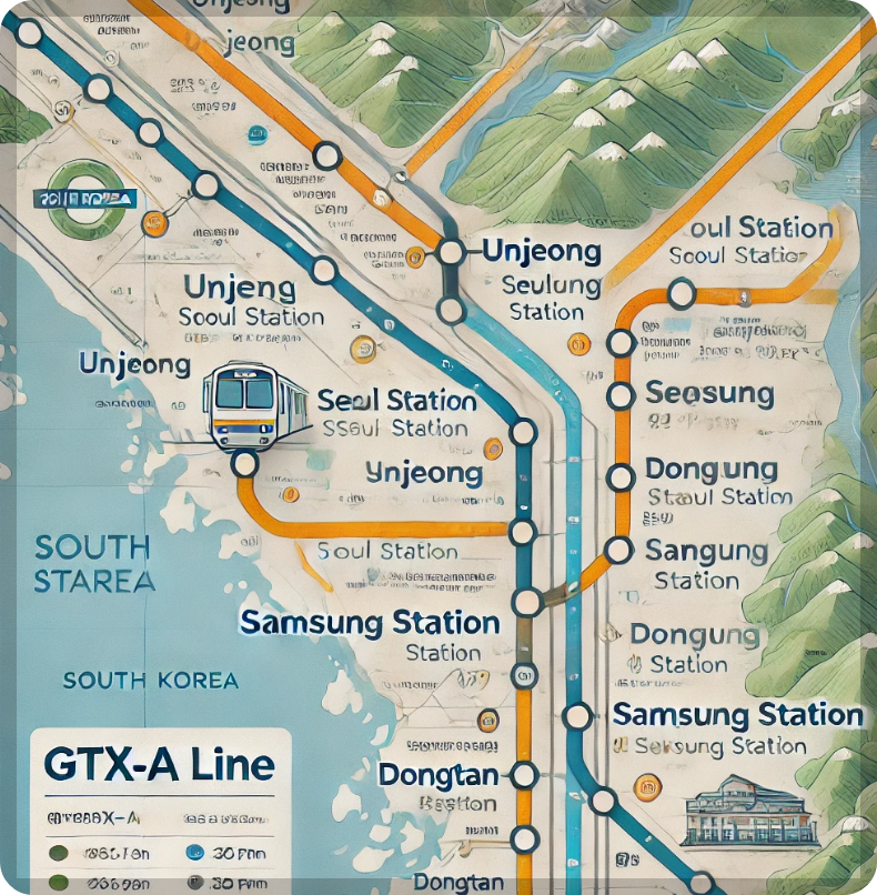 GTX-A 노선은 파주 운정에서 동탄까지 연결되는 대한민국 최초의 광역 급행철도입니다. 운정역은 이 노선의 출발점으로, 주요 도시인 일산, 서울 삼성역 등을 20~30분대로 연결할 예정입니다.